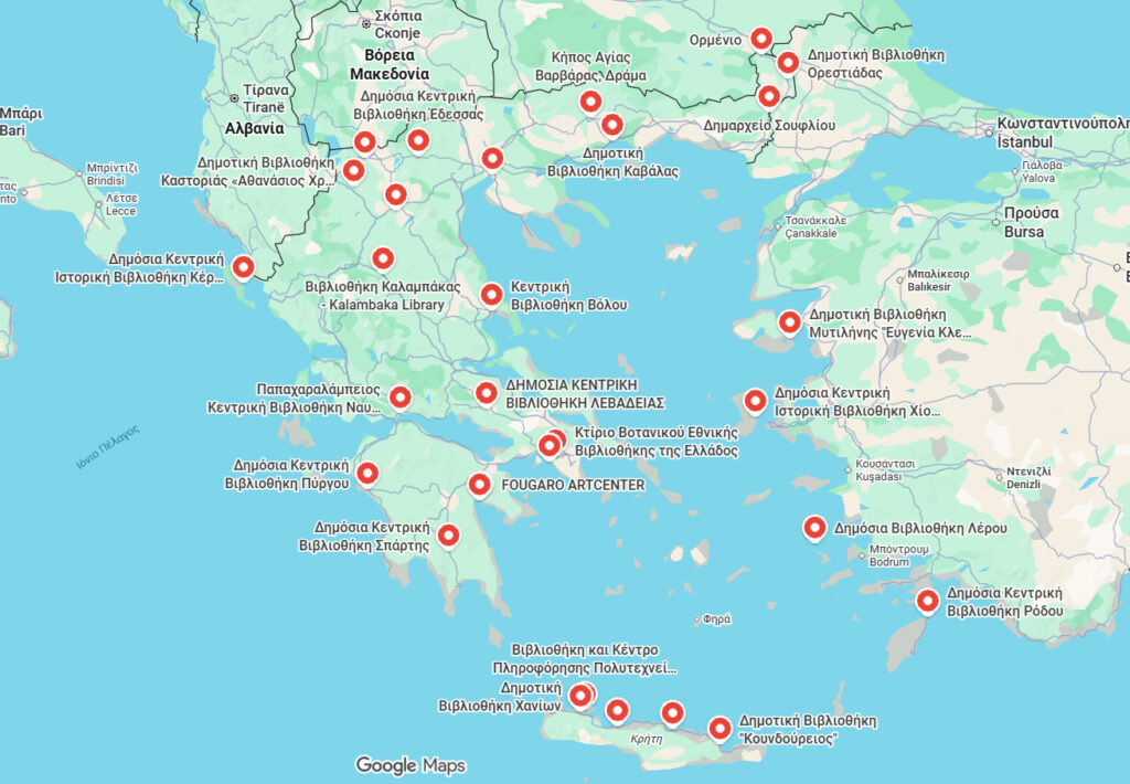 Στον χάρτη οι βιβλιοθήκες στις οποίες υπάρχει και μπορείτε να διαβάσετε το βιβλίο μου “Αναμνήσεις στη σκόνη”.