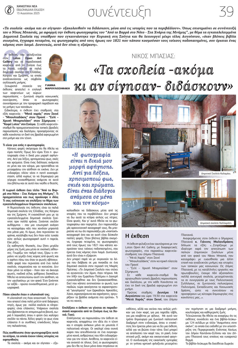Ολοσέλιδη συνέντευξη στο ένθετο περιοδικό «Διαδρομές» της έντυπης εφημερίδας ΧΑΝΙΩΤΙΚΑ ΝΕΑ την Παρασκευή 15 Αυγούστου 2025.